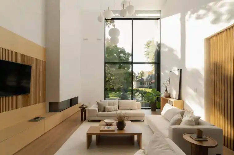 UNDESERVINGLY OVERLOOKED – A gentle fusion of Scandinavian and Japanese design, The Emperor sits proudly in Toronto’s charming Princess Anne Manor neighbourhood. This detached custom build is an architectural wonder of the west end with smooth finishes, oak floors and panelling, plunging sight lines and cascading sunlight. Hidden doors reveal themselves at your fingertips to unassuming ensuite bathrooms dressed in creams and stone or covert closets with abundant storage – its invisible lines maintain minimalism at the forefront of its demure design. Dramatic floor-to-ceiling windows rise 21 feet high in the main living, wide open to a generously sized dining room and bright kitchen with an exceptional breakfast island and concealed coffee nook. Fluting and custom millwork anchors the front entrance and frames the tv, complimenting the microcement finished gas fireplace. A constellation of soft lights quietly illuminates the home, a spectacle when the sun goes down, while its tobacco coloured facade stretches across the 76 foot wide lot and leads to an inground saltwater pool at the rear. Beneath century old canopy trees, around slow swooping roads, this one-of-a-kind modern build is two minutes from St George’s Golf & Country Club & only ten minutes to Pearson Airport. Over 5000 total square feet, your choice of two primary bedrooms and multiple flex spaces on the top floor with the option to convert them to extra bedrooms – executives, creatives, gamers, podcasters, families and fitness enthusiasts will find limitless potential and a whole new meaning to going home at 38 Ravensbourne.