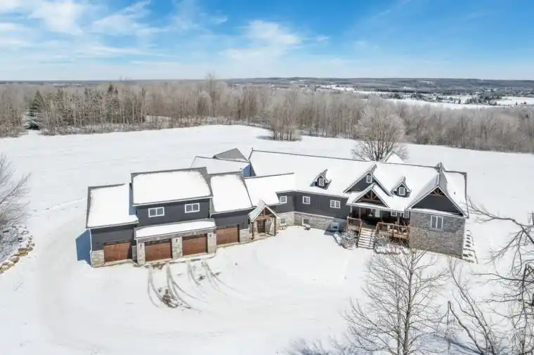 FAMILY COMPOUND | Built in 2022, this expansive 9,000 sqft estate on 100 acres is ideal for multi-generational living, family compound use, or rental income potential. The property includes a custom main residence, a legal ranch-style accessory apartment with private laundry & a self-contained loft suite above a heated 4-car garage, offering exceptional flexibility. A grand foyer flows into a stunning living room featuring floor-to-ceiling windows & expansive panoramic views of the acreage. The main home features 3+2 bedrooms, 3 full & 2 half bathrooms, 9′ ceilings & engineered hardwood throughout the main level. The great room showcases 19′ vaulted ceilings with walk-out access to a covered deck overlooking the pool.The chef’s kitchen & formal dining area are designed for entertaining, complete with quartz countertops, oversized custom island, double farmhouse sink, and premium stainless steel appliances. The primary suite is a private retreat with deck access, dual walk-in closets & a spa-inspired 5-piece ensuite featuring a soaker tub, walk-in shower, dual quartz vanity & private water closet.The walk-out lower level includes a large recreation room, two additional bedrooms & a dedicated salon with powder room, ideal for a home business, studio, or professional workspace, finished with durable vinyl plank flooring.The legal accessory apartment offers vaulted ceilings, an open-concept layout, quartz kitchen counters, private covered deck & in-suite laundry – perfect for extended family or income-generating rental use. The loft suite includes a bedroom, 4-piece bath, kitchenette & private deck for guests or independent living.The heated 4-car garage features 10′ and 14′ ceilings, ideal for car enthusiasts, storage, or workshop use. Outdoors, the 100-acre property supports hiking trails, hobby farming, recreational use, or a private nature retreat. Enjoy a resort-style outdoor setting with a heated 20′ x 40′ saltwater pool, multiple decks & expansive green space.