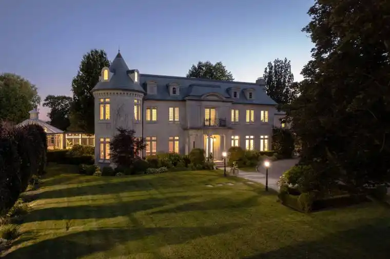 Arguably one of Torontos most iconic estates, this French-style chateau is an extraordinary expression of European grandeur on a 3.12-acre double lot in the prestigious enclave of Bayview Ridge. Designed by renowned architect Gordon Ridgely, the residence commands unobstructed western views over the Rosedale Golf Club. Beyond the stately stone gates and circular drive, manicured gardens by Ron Holbrook frame a breathtaking setting featuring a negative-edge infinity pool, a reflecting pond with a stepped waterfall, tennis court, kitchen gardens, flagstone terraces, and a stone cabana. The striking facade spans nearly 150 feet, clad in Indiana buff limestone and rubble stone with Vermont unfaded green slate shingles and lead-coated copper details. An ivy-clad turret anchors the asymmetrical design, lending the home its signature silhouette. Inside, over 15,000 square feet of living space showcases Brazilian cherry wood floors with African wenge inlay, acid-etched antique Crema Marfil marble, coffered ceilings, Indiana limestone fireplaces, and solid North American cherry doors. Six principal bedrooms and two additional suites are complemented by ten baths and warm, richly detailed interiors. The main floor features an impressive library and office with wood-burning fireplace, a grand dining room with artisan-painted walls and ceilings, a conservatory beside the spacious family room, and a sunlit morning room perfect for coffee. Three staircases, including a hidden passage, lead to the lower level with a Bordeaux-inspired wine cellar, cigar room, gym, nanny suite with two bedrooms, a full kitchen, and a large recreation space. Upstairs, the primary suite offers a six-piece spa bathroom, dual dressing rooms, gas fireplace, and sweeping views. Each bedroom enjoys an ensuite bath and sitting area, blending luxury with practicality. This remarkable estate is a once-in-a-generation offering at once grand, intimate, and built to endure.