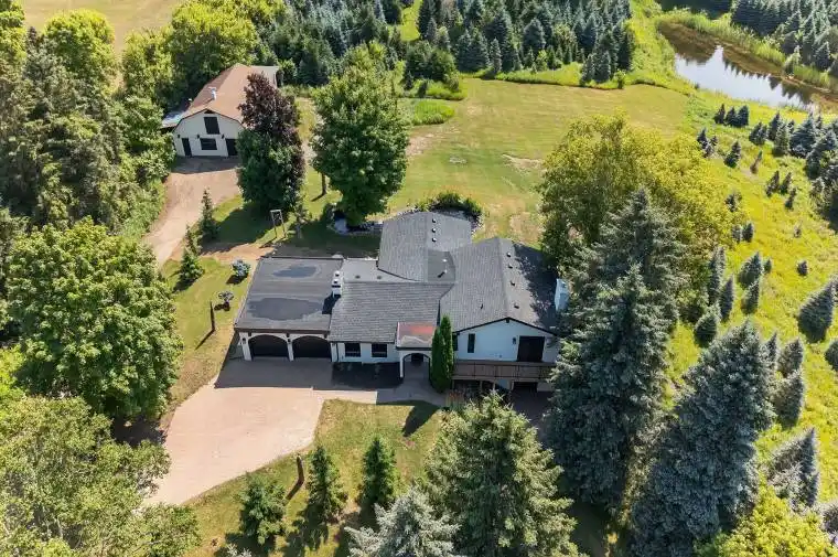 Located just above Highway 9, minutes from Hwy 9 and Airport Road this 25 acre retreat like setting features rolling treed landscapes, ponds and a 3 bedrooms, 4 bathrooms 4 level side split taken back to the studs and fully remodelled. This designer finished home offers bright and spacious living, multiple walkouts, stunning finishings and fixtures all brand new and never lived in! Upper level with 2 bedrooms with ensuites. Main level features an open concept living room and kitchen with breakfast bar and sunken eating area, mud room, laundry and half bath. Walkout lower level with wood burning fireplace, 3rd bedroom and four-piece bath. From the private tree lined drive to the koi pond overlooking the spring feed pond and enchanting panoramic views of mostly blue spruce creates picturesque scenery all year round. The 25 ft x 45 ft barn could be used for animals, storage for recreational vehicles or both.
