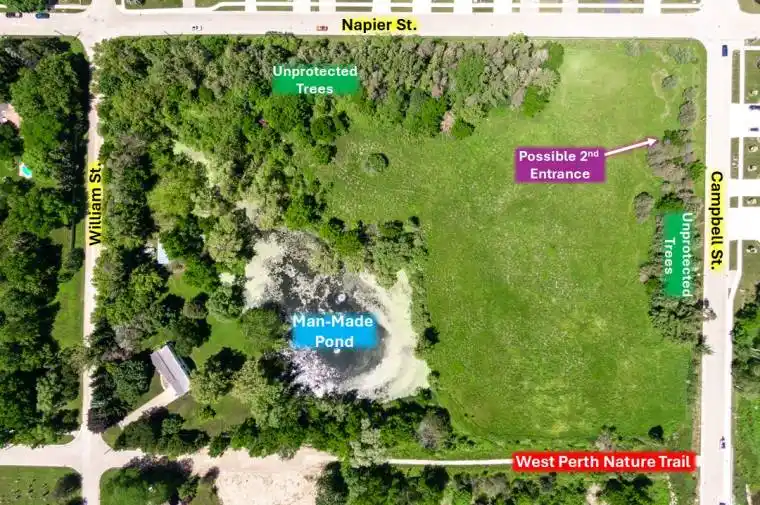 Centrally located 8.5-acre development parcel in the welcoming West Perth community of Mitchell. At least 4.5 developable acres, subject to an EIS to be completed by Buyer at time of planning applications. Potential reduction of manmade pond to be assessed as part of such EIS. 5 concept plans in place by the Sellers’ consultant for a mix of 8 single family lots, 28 bungalow townhouse units, 72-80 stacked townhouse units, or a 6-storey, 94-unit apartment building. New concept/site plans could be developed by Buyer at time of planning applications. Relatively short term development window is possible. Roughly $200,000 has already been spent by the Sellers on bringing utilities (except hydro) to the Napier Street lot line. Sanitary sewers are readily connectable. Support from the Municipality of a possible second entrance to this parcel via Henry Street. Close to golfing, walking trails, parks, medical centre, schools, and shopping. Located 12 miles east and west from hospitals in Seaforth and Stratford. Roughly 20, 40 and 45 minutes to Stratford, London and Kitchener, respectively.