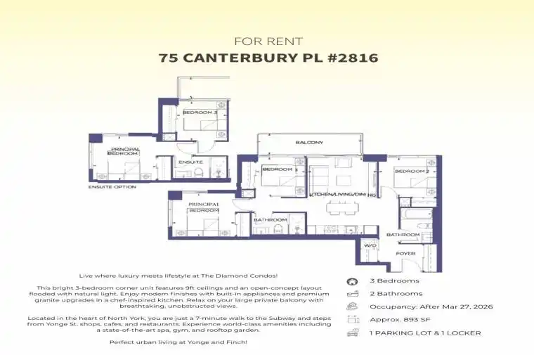 Sun-Drenched Corner Suite at the Prestigious Diamond Condos. 3 Bed, 2 Bath with $$$ spent on upgrades. Features 9ft ceilings, a large private balcony with city views, and a designer kitchen with granite counters/backsplash and built-in appliances. Perfectly situated just steps from Yonge St, TTC, and a 7-min walk to the Subway. Quick 401 access. Includes Parking & Locker. Residents enjoy elite amenities: Spa, Gym, Rooftop Deck, and Game Room. Exceptional value in a prime North York location!