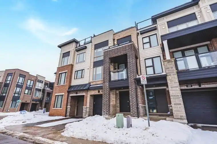Welcome to this beautifully upgraded executive townhome. Located in a highly sought-after community just minutes from Highways 403 and 407, and steps from shopping, dining, and everyday conveniences. This spacious 3-storey home boasts upgraded hardwood flooring on the main level and a solid oak staircase. The bright and open second level features a sleek kitchen with stainless steel appliances, quartz countertops and upgraded backsplash and light fixtures. The kitchen flows seamlessly into the dining and living area which boasts a stunning stone feature wall. Step out onto the balcony for a perfect extension of your living space. Upstairs you’ll find two bedrooms, with the primary bedroom offering a closet and a private 3-piece ensuite. The home offers an expansive rooftop terrace an entertainers dream with sweeping views. The ground level features a dedicated laundry area, interior entry from the garage, and additional storage space.