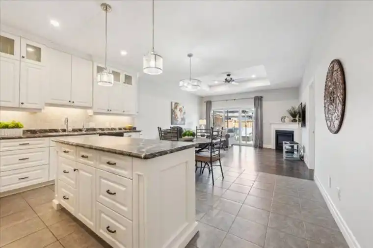 Welcome to 28 Bur Oak Drive – Bungalow townhouse with no condo fees! This lovely move-in ready townhouse offers a main floor primary bedroom, 2 car parking and is located close to shopping and amenities in Elmira. With 2,440 sq ft of total finished living space, this townhouse has 2+1 bedrooms and 3 bathrooms. Enter through the front foyer, past the front bedroom/den and the adjacent 4 piece bathroom and into the open concept kitchen and living room . The white kitchen has ample cupboard space, a large island and dinette, a great spot for your morning cup of coffee! The living room features a tray ceiling, hardwood floors and a gas fireplace. The primary bedroom has a tray ceiling, a walk-in closet and a 4 piece ensuite with shower and double sinks, no need to share your space! Also found on the main floor is the laundry room and access to the garage. Downstairs you will find an extra large rec room, an additional bedroom and a 3 piece bathroom. Have pets? This home has a pet washing station under the stairs! The backyard is a summer oasis! The fully fenced landscaped yard has a deck with pergola with built-in bench. This home is in a great location with easy access to shopping, HWY 85, and walking trails along the Lions Ring Trail.