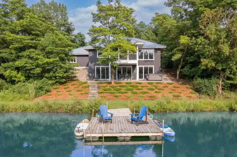 MUSKOKA IN GRAND BEND | WATERFRONT ON PRIVATE LAKE w/ SPECTACULAR VIEWS | FULLY FURNISHED TURNKEY PACAKAGE | STEPS TO SANDY BEACH ACCESS: Welcome to Wee Lake, Grand Bend’s best kept secret featuring a crystal clear sparkling blue spring fed private lake for swimming, paddle boarding, fishing & kayaking + stellar skating & family hockey in the winter + access to the Ausable River for even better fishing! Fall in love with this young custom 4 bed/4bath walk-out bungalow, one of only 5 lakefront properties nestled into this secluded subdivision, which is a small & quiet single cul de sac community on the beachside of the HWY. With only 36 parcels total & lake access limited to Wee Lake residents (sharing 1/36 ownership of lake), this tranquil & peaceful naturally fed sparkling phenomenon is barely used. This stunning architecturally designed custom masterpiece fronts the lake w/ 134′ of priceless linear water frontage. Providing exceptional main floor living framing-in nonstop lake views + a sprawling lower level walking out to your included hot tub & swimming/fishing dock just 50 ft from your poured concrete patio, this is a 10+! The layout is brilliant, w/ soaring main level ceilings inc. an impressive 20+ ft vault & 10 ft ceilings throughout rest of main, a stellar master suite w/ ensuite/walk-in, laundry w/ sink + 2nd laundry in lower, 2 more main level bedrooms (one w/ a 1/2 bath ensuite/ ideal for home office), 2 sunrooms (guest sleepers), 2 gas fireplaces, lower level walk-out w/ bed & full bath + wall to wall windows – simply perfect. Imagine sipping your morning coffee while the kids or grandkids swim off your private dock w/ the dogs enjoying their fenced in side-yard / dog run. As an ideal family get away, short term rental money maker, or yr round principal residence in the booming beach town of Grand Bend, this is a winner, just to steps to one of our most secluded area beach access points, the Pinedale Rd beach path. Full turnkey package may be available!