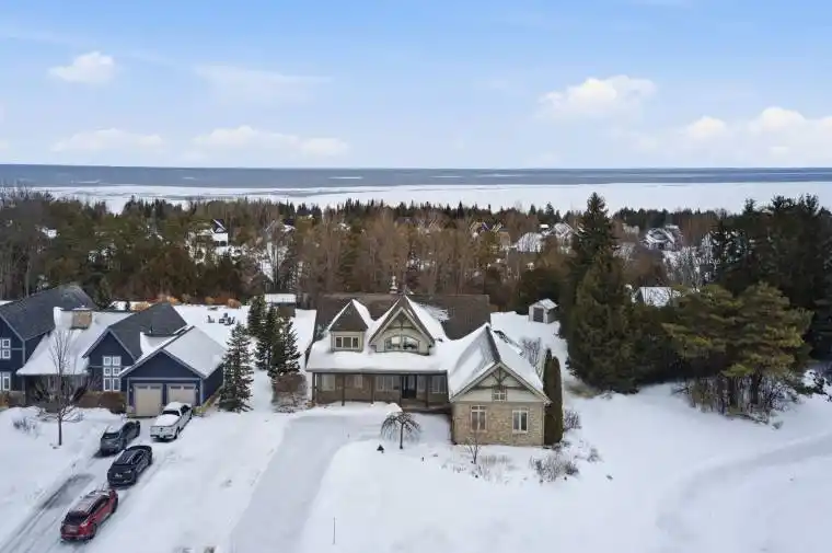 Welcome to 176 High Bluff Lane in the sought-after Trailwoods community of Thornbury, a beautifully crafted custom home offering exceptional main-floor living just moments from the water, trails and vibrant downtown. Designed with comfort and elegance in mind, the main level showcases vaulted ceilings, a stunning stone fireplace and an abundance of natural light. The spacious kitchen is the heart of the home, featuring a large island, walk-in pantry and seamless flow to the dining and living areas, perfect for entertaining. A dedicated main floor office, convenient laundry/mudroom and a serene primary suite with walk-in closet and luxurious 5-piece ensuite complete this level. Upstairs, two generous bedrooms each offer their own private ensuites ideal for family or guests. The finished lower level provides additional living space with in-floor heating, perfect for recreation, media and fitness. Built as the Trailwoods model home, this property has been meticulously maintained and thoughtfully upgraded. Highlights include a 7KW Generac generator, 200 AMP service with whole-home surge protection, dual sump pumps with generator backup, a 5-ton Carrier A/C (2020), Rinnai Combi Boiler (2020), Life Breath HRV, water softener, Honeywell True Steam humidifier, and 24/7 monitored alarm system.The insulated garage features LED lighting, heater and existing gas line. Exterior features include stamped concrete porches, Hardy Board siding, refreshed wood beams (2025), a 100 sq. ft. garden shed, extended landscaping with full irrigation, and a recently sealed driveway. An exceptional offering in West Thornbury