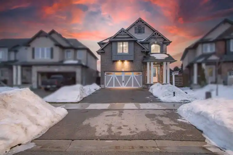 Make a statement the moment you arrive. Step into a grand, sun-filled foyer with soaring ceilings and a striking 7-ft chandelier set within an impressive 20-ft entrance-an unforgettable first impression that sets the tone for this open and elegant home. This nearly new, custom-built detached residence offers Tarion warranty remaining and sits on a rare oversized pie-shaped lot, providing exceptional outdoor potential. The main floor features high ceilings throughout and an upgraded kitchen complete with quartz countertops, extended cabinetry, stainless steel appliances, a custom appliance garage, and a stylish accent slat wall-flowing seamlessly into the main living space, ideal for both everyday living and entertaining. Upstairs, enjoy a spacious family room that can easily convert to an additional bedroom, along with a well-appointed primary suite featuring a walk-in closet and a 4-pc ensuite. Premium wide-plank flooring on the main level, a double-car garage, and a sought-after family-friendly neighbourhood close to Highways 401 & 403, shopping, and daily conveniences complete the package. A rare combination of modern design, premium lot size, and thoughtful upgrades-this is the kind of home buyers wait for.