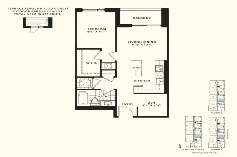 Bright and spacious 1 Bedroom + Den suite (640 Sq Ft) with a large 50 Sq Ft balcony, located in a brand-new low-rise condo in the prestigious Beverley Glen community. This well-designed unit features a functional open-concept layout, 9 ft ceilings and large windows throughout. Modern kitchen with quartz countertops, stainless steel appliances, and ample cabinet space. Generous primary bedroom with walk-in closet, plus a versatile den ideal for a home office. Includes 1 parking space and 1 locker. Excellent building amenities include 24-hour concierge, fitness center, yoga studio, indoor basketball court, co-working space, meeting room, party room, outdoor BBQ terrace, kids play area, and pet care facilities. Conveniently located steps to parks and public transit (VIVA/YRT) and minutes to Highways 7, 400, 404 & 407. Close to Promenade Mall, shopping, restaurants, and daily conveniences. Ideal for professionals. AAA tenants preferred.