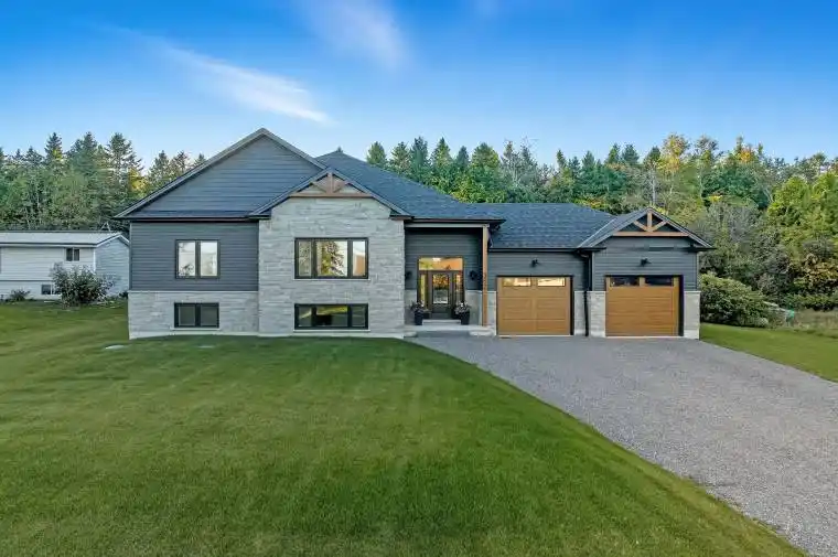 Welcome to this stunning custom-built raised bungalow on a private 80×200 ft fenced lot withno rear neighbours, directly across from Lake Scugog. Offering 3+2 bedrooms, 3 full bathrooms, and 2 kitchens, this home delivers high-end finishes, thoughtful design, and versatility forfamilies or multi-generational living. The main level features a bright open-concept layout with 9 ft ceilings and a soaring 14 ft vaulted ceiling in the living area, complete with a fireplace and two walkouts to a spacious back deck with glass railings and a natural gas hookup. The custom kitchen showcases quartz countertops, a large island, built-in dishwasher ,and gas range. Hardwood flooring runs throughout the main floor, complemented by custom oak stairs and railings, plus a built-in two-zone speaker system in the main living area and primary suite. The primary bedroom offers a fireplace, walk-in closet, and a finished 5-piece ensuite. The fully finished lower level provides excellent flexibility with a second kitchen,two oversized bedrooms, full bathroom, 9 ft ceilings, large above-grade windows, a third fireplace, and a walk-up to the garage-ideal for an in-law suite or potential second unit. Outside, the massive driveway parks 10+ cars. The exterior features stone and siding, with sconces and soffit lighting that highlight the home at night. The private backyard backs onto forest with ample space for family use. Additional features include a heated, insulated double garage with pot lights, 9 ft ceilings on both levels, 200 amp service, rough-in for second laundry, and premium finishes throughout. Located in a quiet, family-friendly neighbourhood, steps to boat launches and near a marina, and a short drive to downtown Port Perry, shops, and restaurants, this home offers an ideal blend of lifestyle and location.